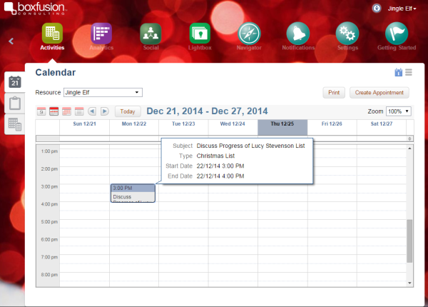 Santa’s Helpers can be added as team members on the Christmas List activities too, so that the relevant Christmas Lists are visible on the corresponding Helpers' Activities page. Appointments and meetings can be created from the list, which are then visible on each Helper’s calendar, ensuring that nobody misses important present-making status calls!