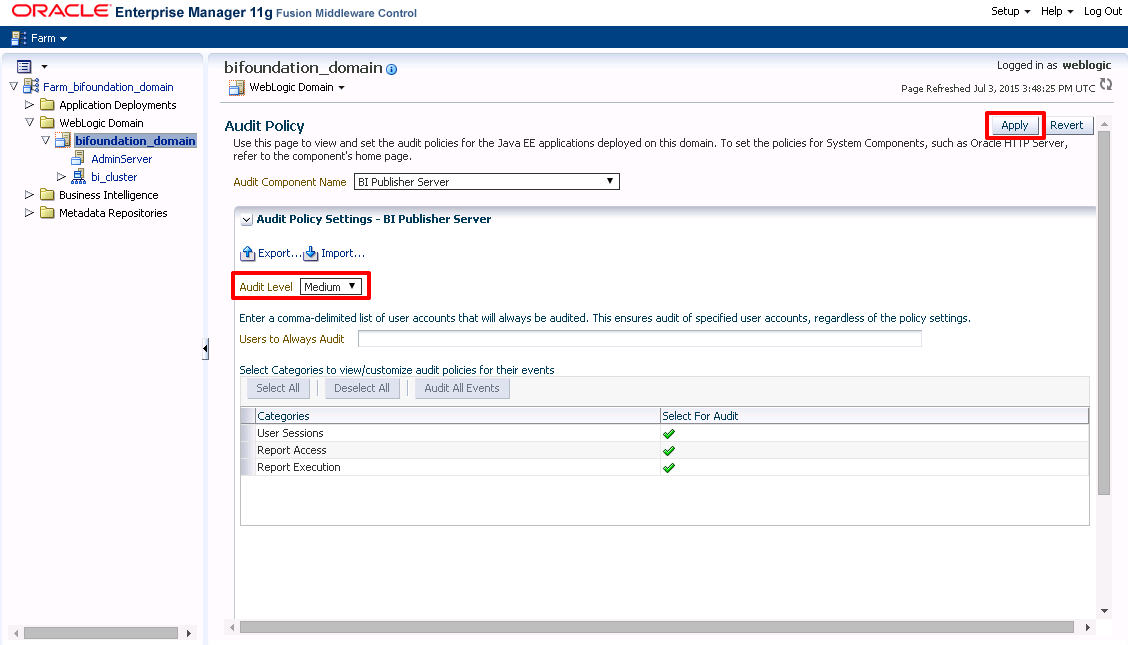 From the Audit Component Name drop down box select BI Publisher Server, change the Audit Level to Medium and then click Apply at the top right of the screen.